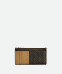 Intrecciato calfskin leather card case with contrasted interior. Product Details - Fourteen card slots, two additional open pockets, one coin purse - Material: Calfskin - Lining: Calfskin - Color: Kaki/Dark Praline - Hardware: Silver finish - Height: 8.5 cm | 3.3" - Width: 16 cm | 6.3" - Depth: 0.5 cm | 0.2" - Made in: Italy - Product code: 766155VCPQA3372