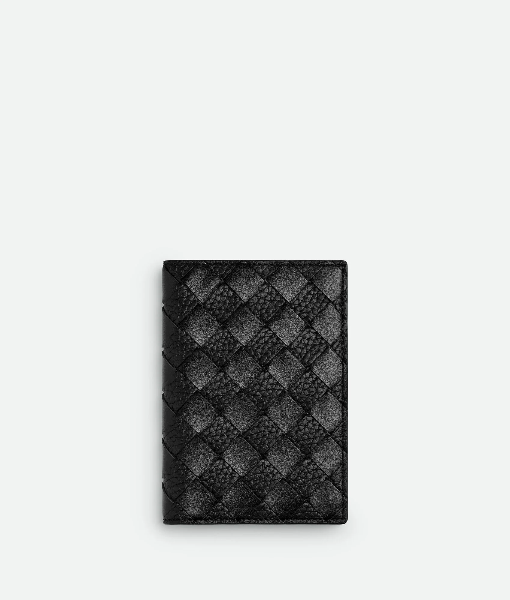 Passport case in contrasted Intrecciato smooth and grainy calf leather. Product Details - Intrecciato calfskin leather passport case - Five card slots, two additional pockets - Lining: Calfskin - Color: Black - Made in: Italy - Product code: 749441V63U11000 Material - Material: Calfskin Size & Fit - Height: 13.3 cm (5.2") - Width: 9.5 cm (3.7") - Depth: 0.5 cm (0.2")