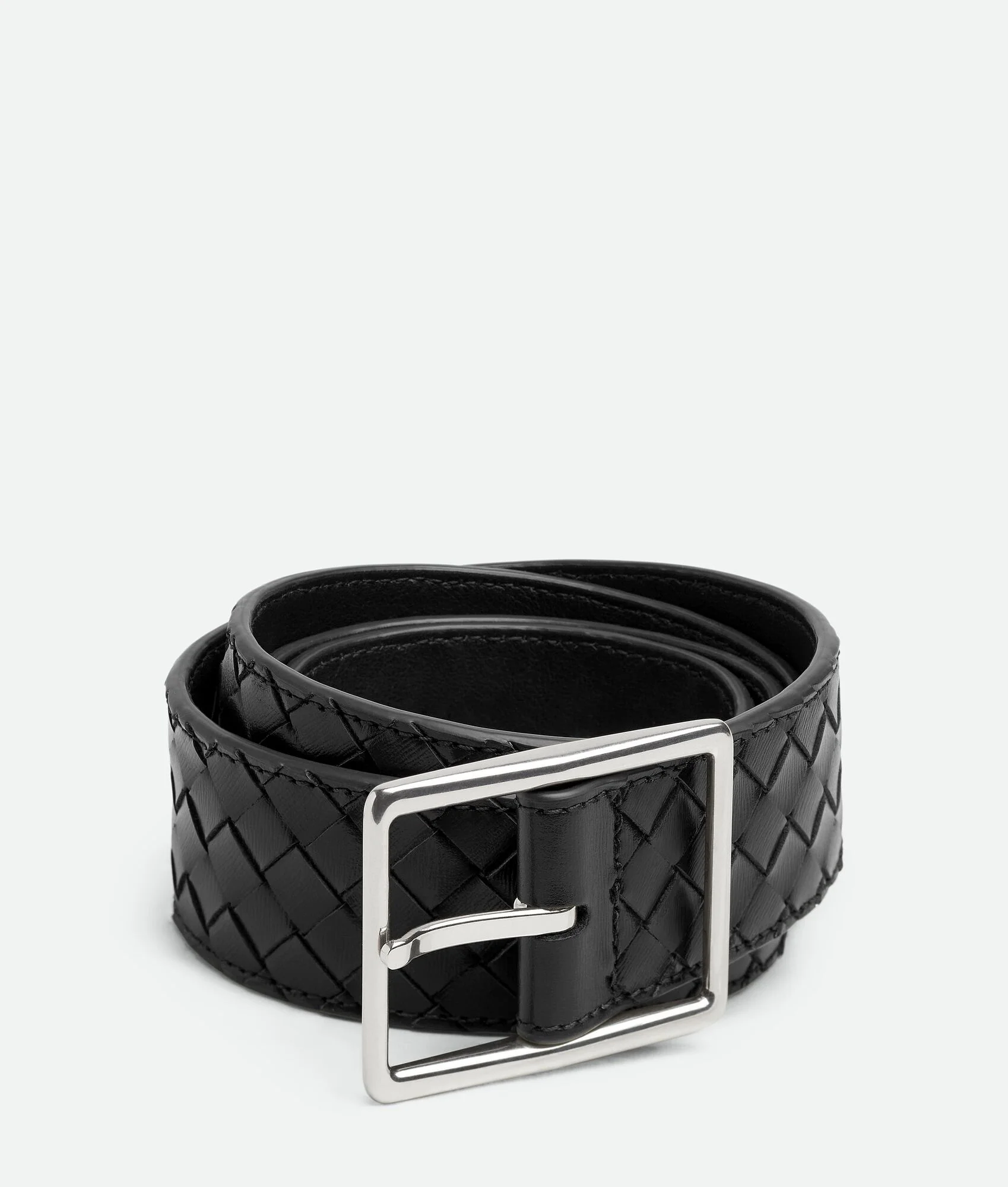 Intrecciato Piccolo calfskin leather belt. Product Details - Buckle closure - Our VN Preserve calfskin leather is crafted using the BioBasedLeather® process, which ensures a limited presence of petrol-based components and exclusive reliance on renewable energy sources. - Material: calfskin - Lining: Calfskin - Color: Black - Hardware: Silver finish - Height: 3.5 cm | 1.4" - Depth: 0.5 cm | 0.2" - Made in: Italy - Product code: 796783V4LQ18803