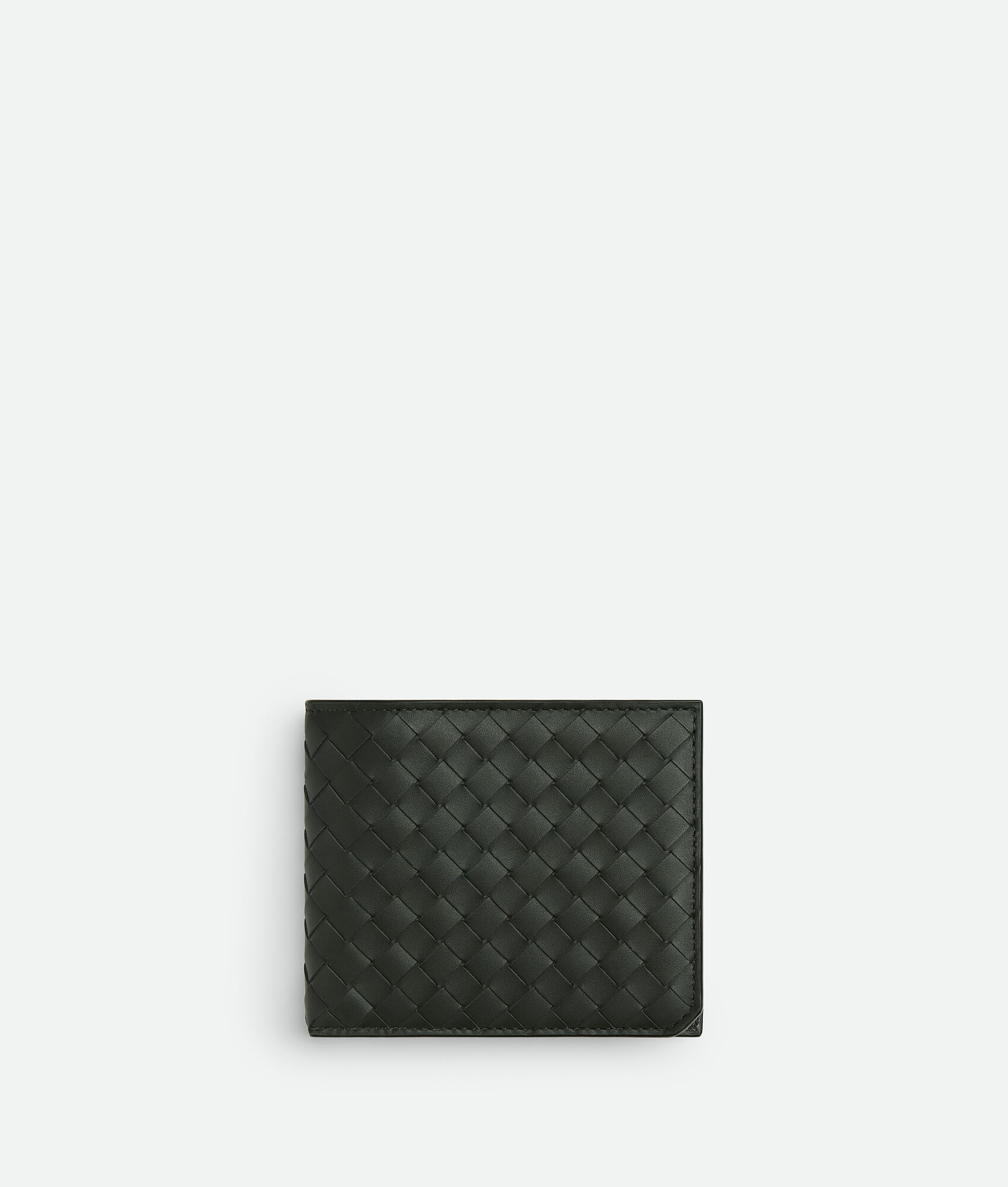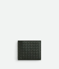 Bi-fold wallet in Intrecciato piccolo calf leather with coin purse. Product Details - Intrecciato piccolo calf leather wallet - Four card slots, two note compartments, two additional pockets, one coin purse - Our VN Preserve calf leather is realized through the BioBasedLeather® process, which ensures a limited presence of petrol-based components and exclusive reliance on renewable energy sources - Material: Calfskin - Lining: Calf leather - Color: Dark Green - Hardware: Silver finish - Height: 9.5 cm | 3.7" - Width: 11 cm | 4.3" - Depth: 1 cm | 0.4" - Made in: Italy - Product code: 805654V4LQ23009