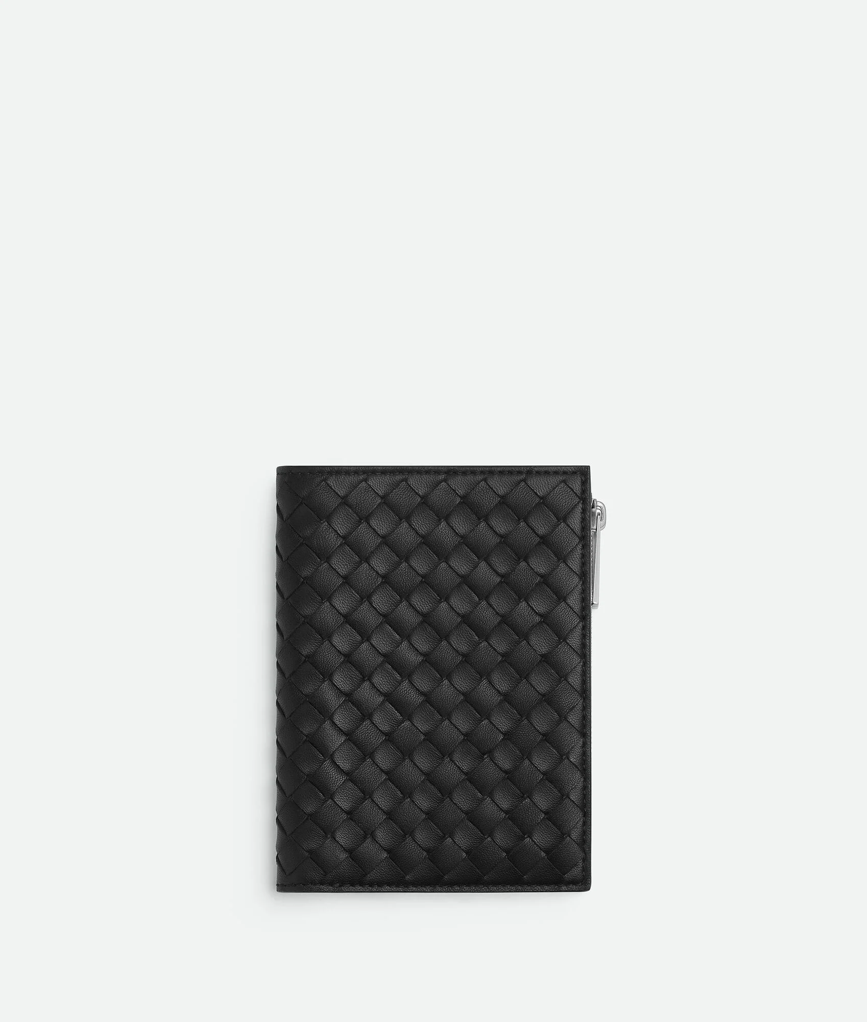 Zipped passport case in Intrecciato piccolo leather. Product Details - Intrecciato piccolo leather passport case - Three card slots, one note compartments, one open pocket to store passport, one zipped coin purse - Zip closure - Lining: Calfskin - Color: Black - Hardware: Silver finish - Made in: Italy - Product code: 854453V4J138803 Material - Material: Lambskin Size & Fit - Height: 13.6 cm (5.4") - Width: 9.6 cm (3.8") - Depth: 2 cm (0.8")