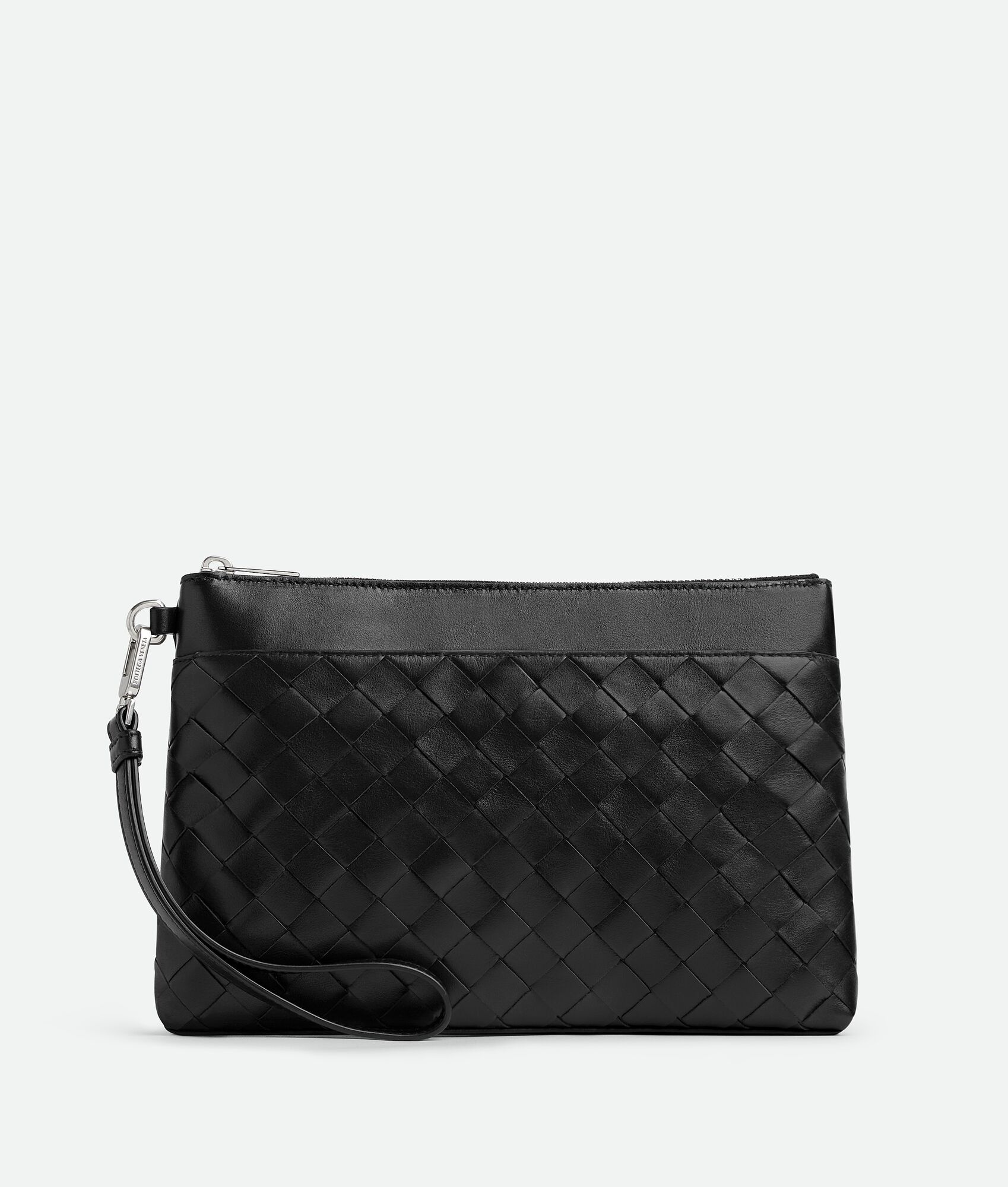 Intrecciato leather pouch with detachable wristlet. Product Details - One single compartment, one internal flat leather pocket with six card slots - Single exterior front pocket with magnetic closure - Detachable leather wristlet with a hook - Zip closure - Material: calfskin - Lining: Nylon - Color: Black - Hardware: Silver finish - Height: 17 cm | 6.7" - Width: 25 cm | 9.8" - Depth: 4 cm | 2.6" - Handle drop: 17 cm | 6.7" - Made in: Italy - Product code: 795712V2HL18803