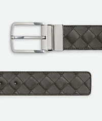 Reversible belt in Intrecciato calf leather. Product Details - Reversible Intrecciato calf leather belt - Metal buckle - Prong closure - Lining: Calf leather - Color: Graphite/Nocturnal - Hardware: Silver finish - Made in: Italy - Product code: 652944VCPQ11044 Material - Material: Calfskin Size & Fit - Height: 3.5 cm | 1.4" - Depth: 0.5 cm | 0.2"