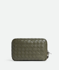 Small pouch in Intrecciato calf leather with detachable wristlet. Product Details - Small pouch in Intrecciato calfskin leather - One single compartment, one internal flat leather pocket with three card slots - One exterior zipped pocket - Detachable leather wristlet with a hook - Zip closure - Lining: Canvas - Color: Crocodile - Hardware: Silver finish - Made in: Italy - Product code: 795253V2HL13248 Material - Material: Calfskin Size & Fit - Height: 13 cm (5.1") - Width: 21 cm (8.3") - Depth: 6 cm (2.4") - Strap drop: 17 cm (6.7")
