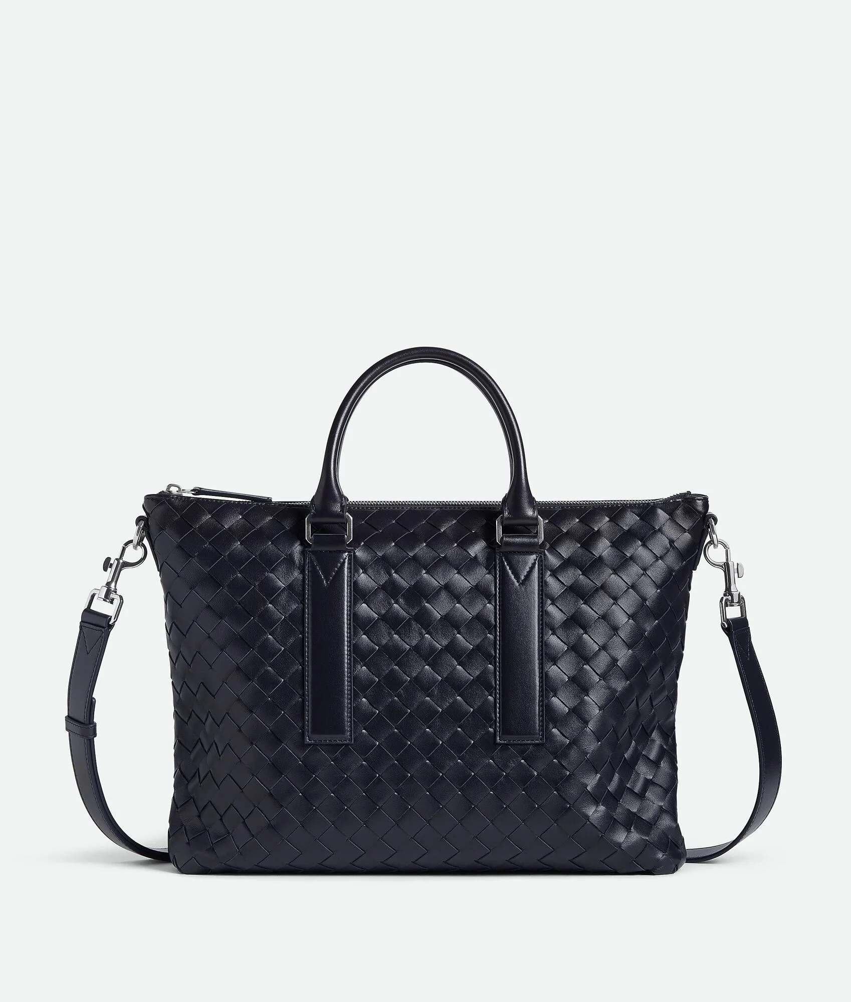 Product Details - Intrecciato soft briefcase with adjustable and detachable strap and top handles - One interior zipped pocket and two flat open pockets - Zipper closure - Lining: Canvas - Color: Nocturnal - Hardware: Silver finish - Made in: Italy - Product code: 815784V2HL14182 Material - Material: Calfskin Size & Fit - Fits a 13" laptop