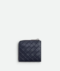 Intrecciato embossed calfskin leather wallet. Product Details - Four interior card slots, one central coin purse, one divider to fold and organize bills - Zip closure - Material: Calfskin - Lining: Calfskin - Colour: Abyss - Hardware: Silver finish - Height: 10 cm | 3.9” - Width: 10 cm | 3.9” - Depth: 1.5 cm | 0.6” - Made in: Italy - Product code: 817741V0AQ14152