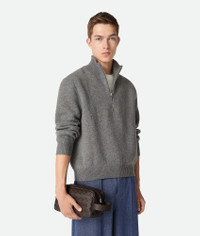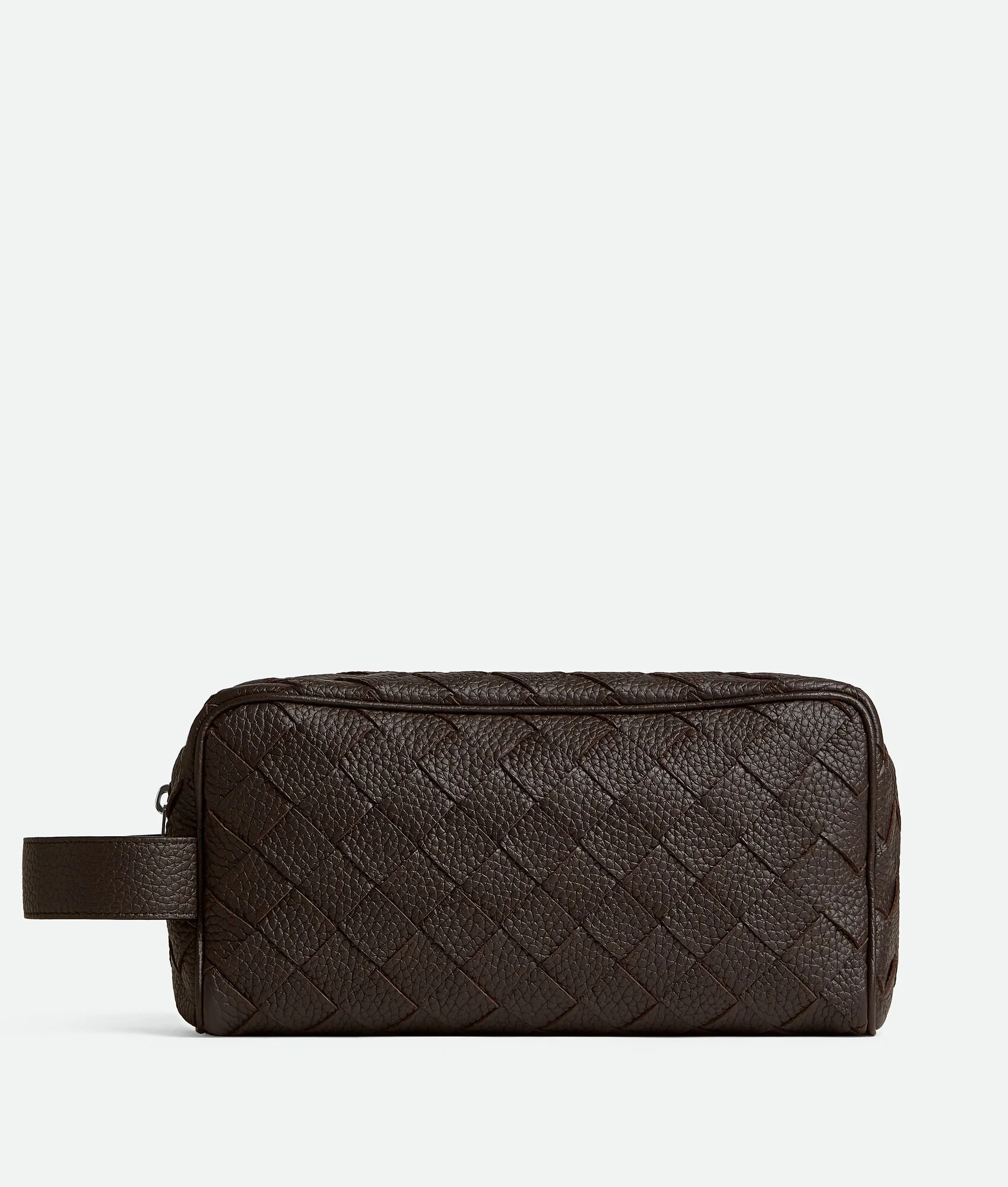 Pouch in grained Intrecciato calf leather with handle. Product Details - Grained Intrecciato calfskin leather pouch with handle - One interior zipped pocket, one open pocket - Zip closure - Lining: Nylon - Color: Fondant - Hardware: Silver finish - Made in: Italy - Product code: 729295V5I502145 Material - Material: Calfskin Size & Fit - Height: 13 cm (5.1") - Width: 26 cm (10.2") - Depth: 10 cm (3.9") - Strap drop: 7 cm (2.8")