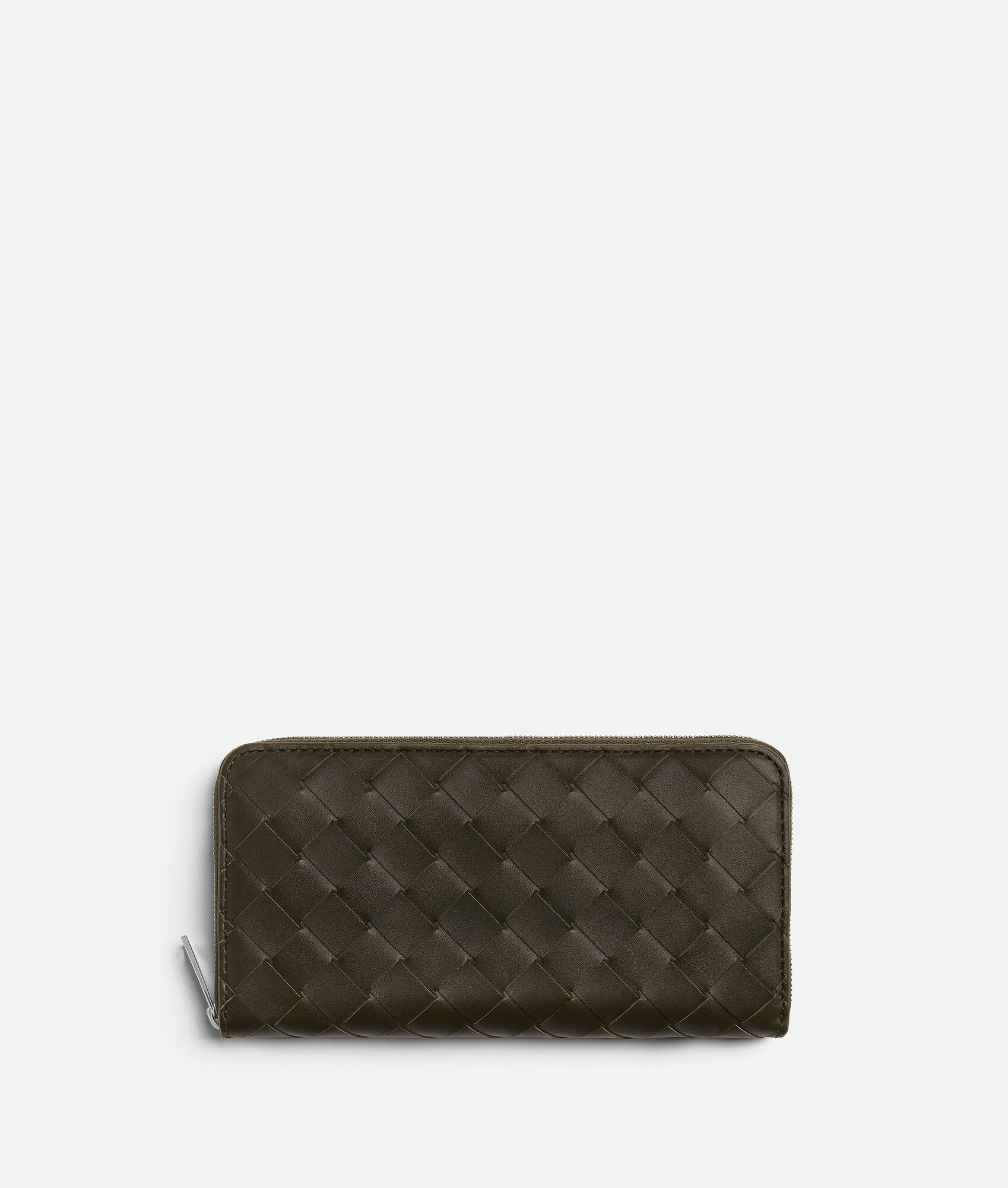 Intrecciato calfskin leather wallet with contrasted interior. Make it unique Product Details - Eight card slots, two bill compartments, two additional pockets, one zippered coin purse - Zipper closure - Material: calfskin - Lining: Calfskin - Color: Kaki/Dark Praline - Hardware: Silver finish - Height: 10 cm | 3.9" - Width: 19 cm | 7.5" - Depth: 2 cm | 0.8" - Made in: Italy - Product code: 749427VCPQ63392