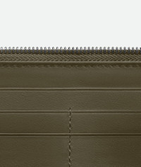 Zip around wallet in Intrecciato calf leather with degrade effect. Product Details - Intrecciato calf leather wallet with degrade effect - Eight card slots, two note compartments, two additional pockets, one zipped coin purse - Zipper closure - Lining: Calf leather - Color: Cypress - Hardware: Silver finish - Height: 10 cm | 3.9" - Width: 19 cm | 7.5" - Depth: 2 cm | 0.8" - Made in: Italy - Product code: 814838V5UH13227