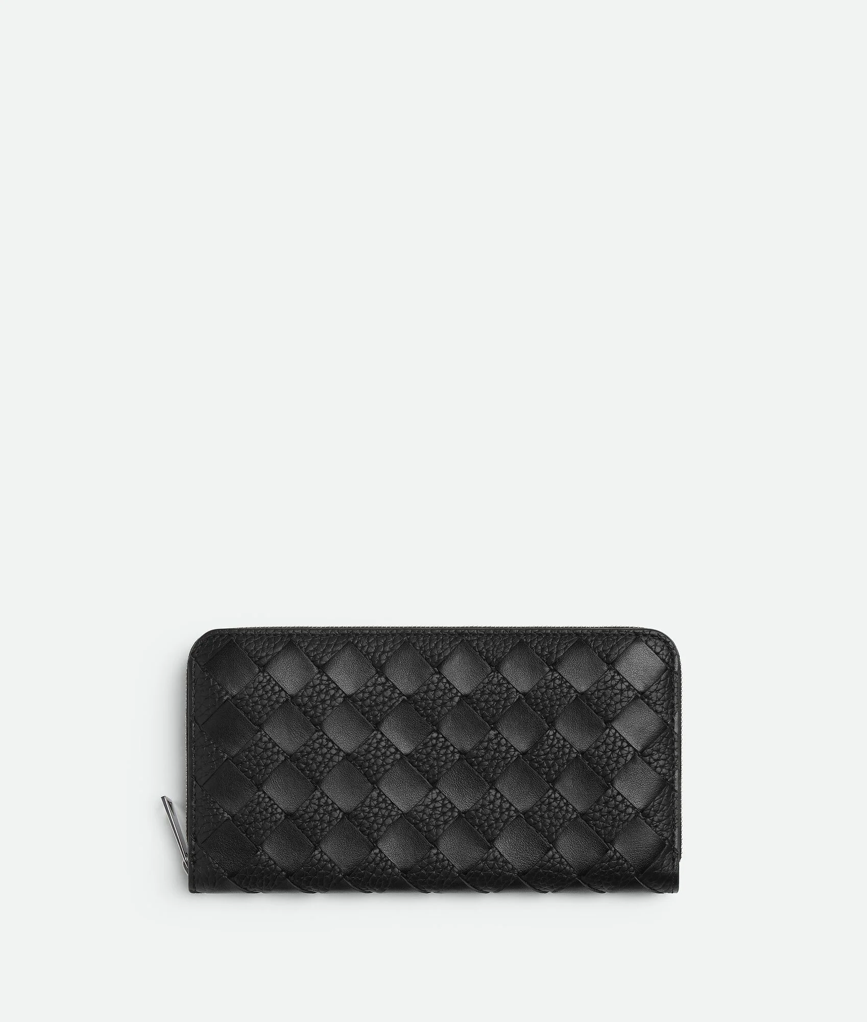 Zip around wallet in contrasted Intrecciato smooth and grainy calf leather. Product Details - Intrecciato calfskin leather wallet - Eight card slots, two note compartments, two additional pockets, one zipped coin purse - Zip closure - Lining: Calfskin - Color: Black - Hardware: Silver finish - Made in: Italy - Product code: 814838V63U18803 Material - Material: Calfskin Size & Fit - Height: 10 cm (3.9") - Width: 19 cm (7.5") - Depth: 2 cm (0.8")