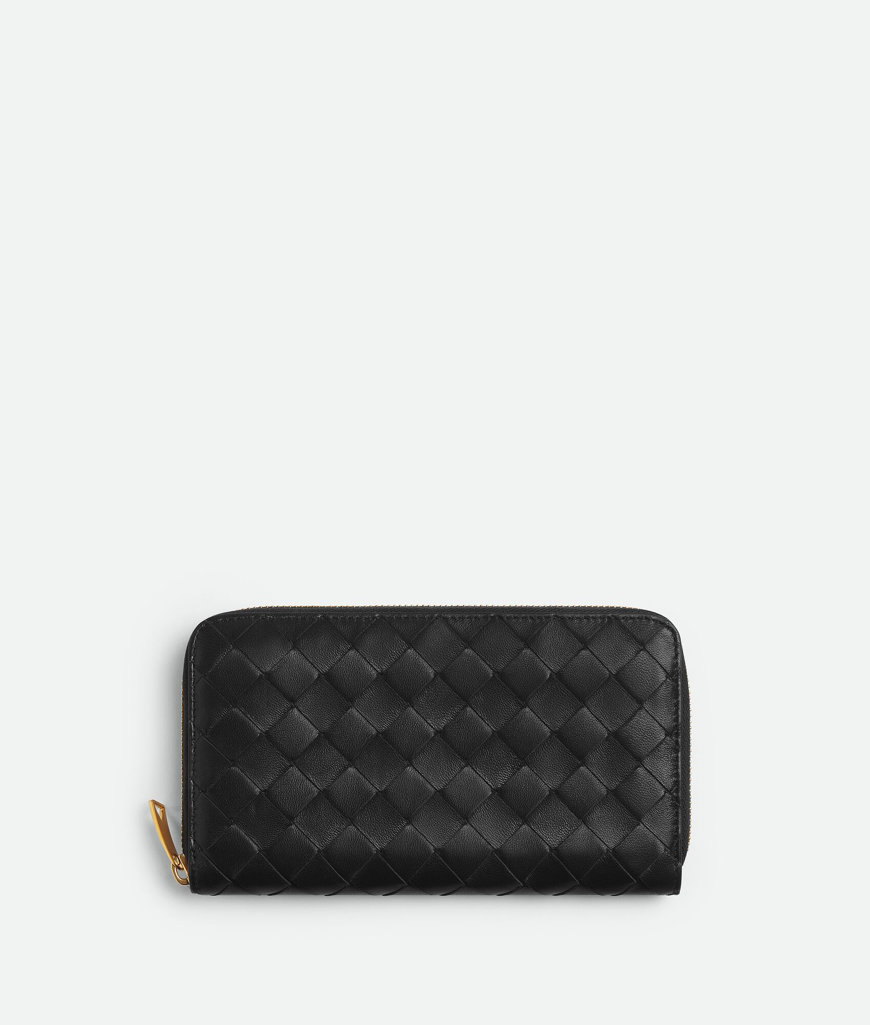 Intrecciato nappa leather wallet. Product Details - Eight card slots, four note compartments, two additional pockets, one zipped coin purse - Zip closure - Material: lambskin - Lining: Calfskin - Color: Black - Hardware: Gold finish - Height: 11 cm | 4.3” - Width: 19.5 cm | 7.7” - Depth: 2.5 cm | 1” - Made in: Italy - Product code: 814674VCPP28425