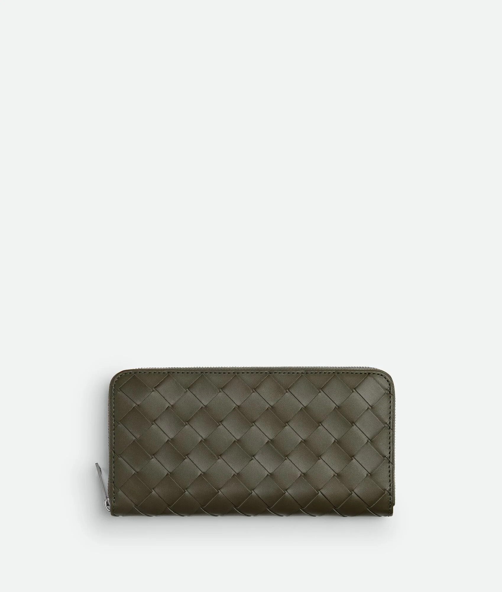 Zip around wallet in Intrecciato calf leather. Product Details - Intrecciato calfskin leather wallet - Eight card slots, two note compartments, two additional pockets, one zipped coin purse - Zip closure - Lining: Calfskin - Color: Crocodile - Hardware: Silver finish - Made in: Italy - Product code: 814838VCPQ43248 Material - Material: Calfskin Size & Fit - Height: 10 cm (3.9") - Width: 19 cm (7.5") - Depth: 2 cm (0.8")