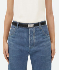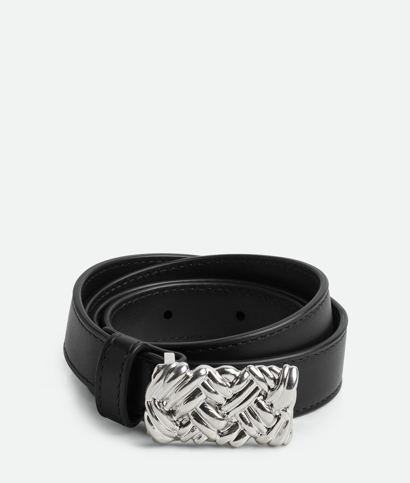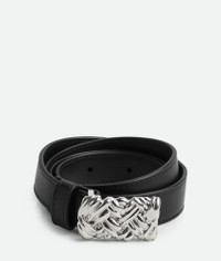 Smooth calfskin leather belt with Intreccio pattern buckle. Product Details - Pin closure - Material: Calfskin - Lining: Calfskin - Color: Black - Hardware: Silver finish - Height: 2 cm | 0.8" - Depth: 0.5 cm | 0.2" - Made in: Italy - Product code: 799697VALKO8803