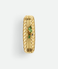 Product Details - Padded Intreccio leather with laminated effect minaudiere - Single compartment - Metallic flower clasp closure - Lining: Lambskin - Color: Gold - Hardware: Brass finish - Height: 11.5 cm | 4.5" - Width: 19 cm | 7.5" - Depth: 5 cm | 2” - Made in: Italy - Product code: 826183V04M18458 Size & Fit - Fits an iPhone Pro, a credit card case, airpods and keys.