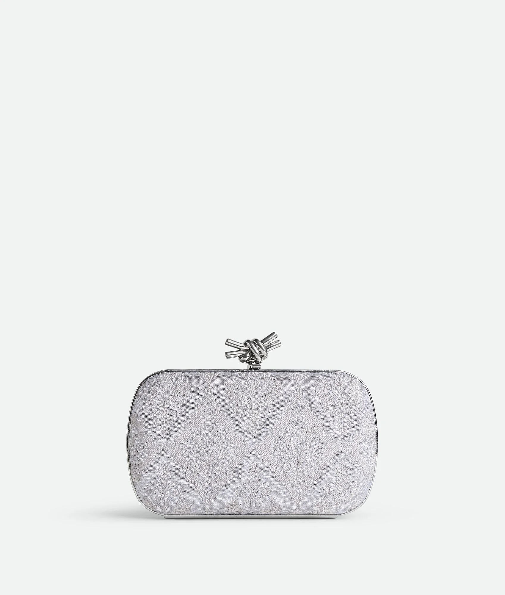 Minaudiere clutch in brocade textile with signature knot closure. Product Details - Brocade textile minaudiere - Single compartment - Metallic knot clasp closure - Lining: Lambskin - Color: Mirth washed - Hardware: Silver finish - Made in: Italy - Product code: 855943V65G25306 Material - Material: Lambskin, polyester, cotton, polyamide, metalized fiber Size & Fit - Height: 11.5 cm (4.5") - Width: 19 cm (7.5") - Depth: 5 cm (2.0") - Fits an iPhone Pro, a credit card case, airpods and keys.