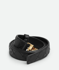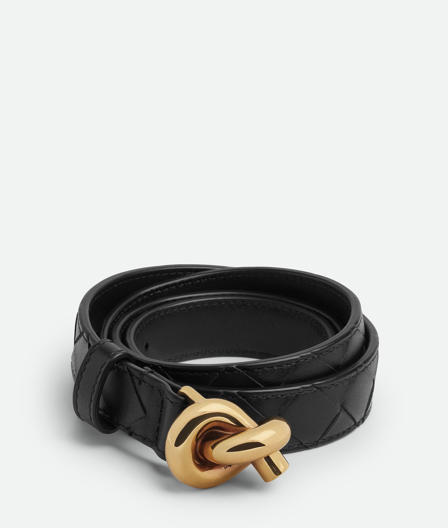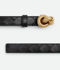 Belt in Intrecciato silky calf leather with signature knot buckle. Product Details - Intrecciato silky calf leather belt - Metal knot buckle - Pin closure - Material: Calfskin - Lining: Calf leather - Color: Black - Hardware: Muse brass finish - Height: 2 cm | 0.8" - Depth: 0.5 cm | 0.2" - Made in: Italy - Product code: 837003V4R431019