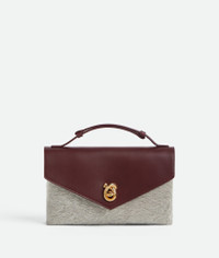 Product Details - Felt and calfskin leather cross-body bag - Adjustable top handle - Adjustable and detachable strap - Two compartments, four card slots and an external flat back pocket - Metallic knot lock closure - Lining: Lambskin - Color: Gray/Madder Brown - Hardware: Brass finish - Made in: Italy - Product code: 844059V5XK11621 Material - Material: Polyester, virgin wool, calfskin Size & Fit - Height: 16 cm | 6.3" - Width: 25 cm | 9.8" - Depth: 5.5 cm | 2.2" - Handle drop: 12 cm | 4.7 - Strap drop: 46 cm | 18.1"