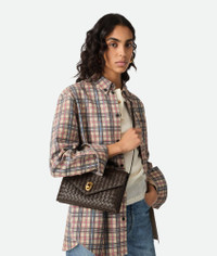 Cross-body bag in Intrecciato leather with adjustable top handle and signature metallic Product Details - Intrecciato leather cross-body bag - Adjustable top handle - Adjustable and detachable strap - Two compartments, four card slots and an external flat back pocket - Metallic knot lock closure - Material: Lambskin - Lining: Lambskin - Color: Fondant - Hardware: Brass finish - Height: 16 cm | 6.3" - Width: 25 cm | 9.8" - Depth: 5.5 cm | 2.2" - Handle drop: 12cm - Strap drop: 46 cm | 18.1" - Made in: Italy - Product code: 817191V08Z02190