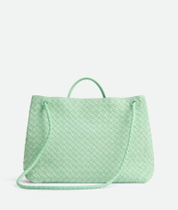 Product Details - Large Intrecciato suede top-handle bag with sliding cross-body strap - Compartmented interior with one zipped pocket, two open pockets - Magnetic closure - Lining: Suede bonded Intrecciato - Color: Wasabi - Hardware: Brass finish - Height: 35 cm | 13.8" - Width: 42 cm | 16.5" - Depth: 18 cm | 7.1" - Handle drop: 9 cm | 3.5" - Strap drop: 45 cm | 17.7" - Made in: Italy - Product code: 766019V1QE63540 Size & Fit - Fits a 16" laptop