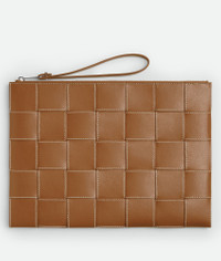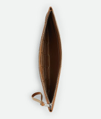 Large Intreccio leather wristlet pouch with edge-stitching detail. Product Details - Large Intreccio leather wristlet pouch with edge-stitching detail - Single interior open pocket - Zip closure - Material: Calfskin - Lining: Calfskin bonded Intreccio - Color: Wood-Natural - Hardware: Silver finish - Height: 25 cm | 9.8" - Width: 35 cm | 13.8" - Depth: 1 cm | 0.4" - Handle drop: 18 cm | 7.1" - Made in: Italy - Product code: 649616V39K22361