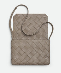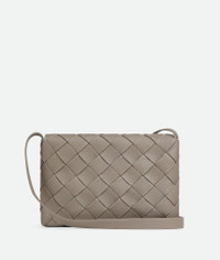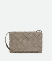 Cross-body bag in grained Intreccio leather with contrasted stitching. Product Details - Large grained Intreccio leather cross-body bag with contrasted stitching and adjustable strap - Single interior zipped pocket - Magnetic closure - Material: Calfskin - Lining: Calf leather bonded Intreccio - Color: Limestone - Hardware: Silver finish - Height: 21.5 cm | 8.5" - Width: 32 cm | 12.6" - Depth: 5 cm | 2" - Strap drop: 46.5 cm | 18.3" - Made in: Italy - Product code: 815796V5R902822