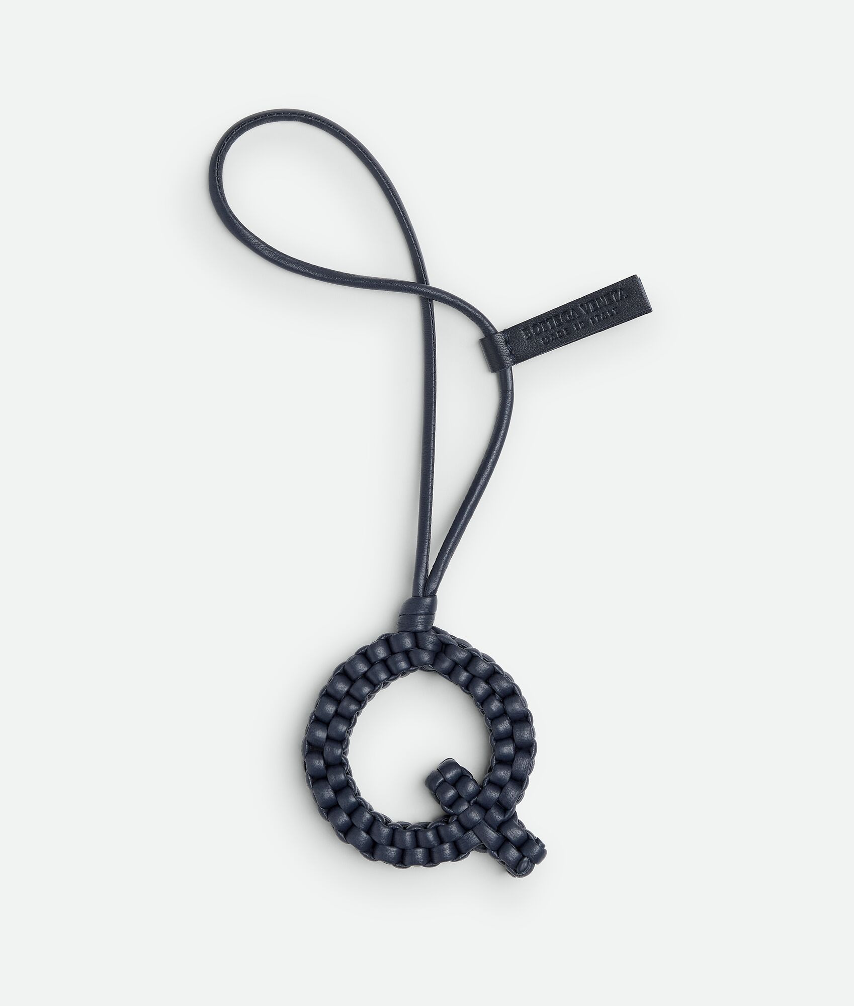 Product Details - Intreccio nappa leather alphabet letter charm with leather lanyard - Bottega Veneta leather tag - Leather lanyard designed to be attached to any handle - Lining: Unlined - Color: Abyss - Made in: Italy - Product code: 844690V3D814140 Material - Material: Lambskin Size & Fit - Height: 7.5 cm | 3" - Width: 7.5 cm | 3" - Depth: 1.5 cm | 0.6"
