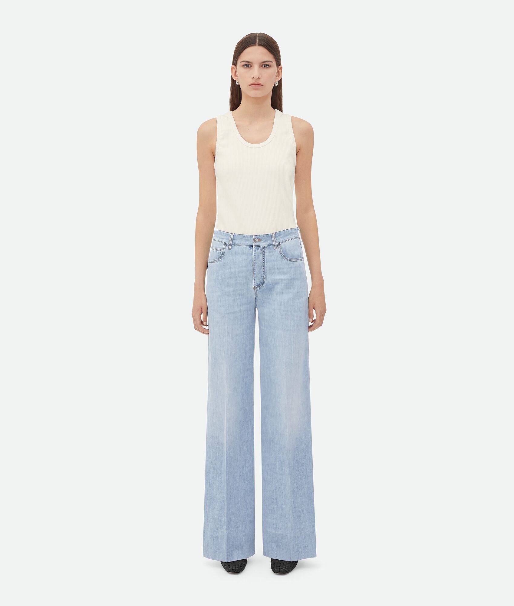 Trousers realised in soft lightweight denim with a new bleached finish. Product Details - Light bleached denim - Button closure - Wide leg - Material: 100% Cotton - Color: Light Bleach - Made in: Italy - Product code: 771871V3N604946 Size & Fit - Model is 177 cm | 5'9" and is wearing a Bottega Veneta size 38