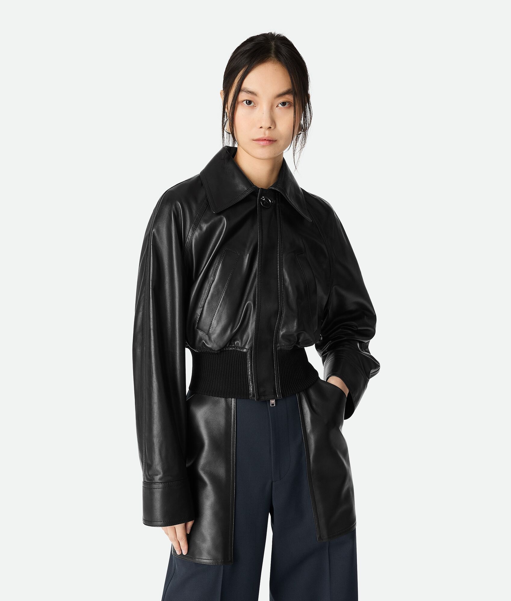 Blouson realised in lightweight smooth nappa leather. Product Details - Lightweight smooth nappa leather blouson - Elasticated waistband - Zipper closure - Fully lined - Slim fit - Material: 100% Lambskin - Color: Black - Made in: Italy - Product code: 835298V5AC01000 Size & Fit - Model is 176 cm | 5'9" and is wearing a Bottega Veneta size 38