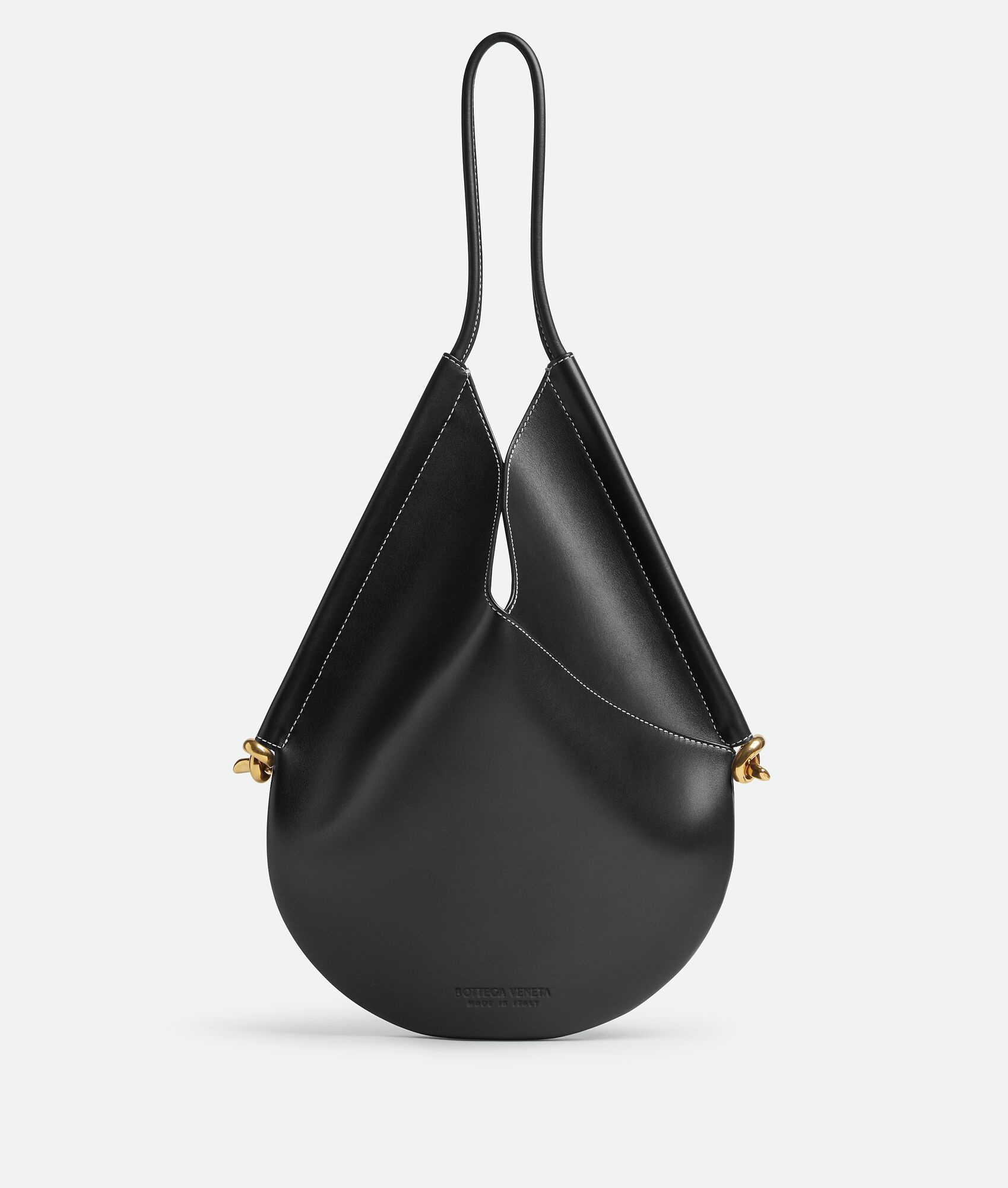 Shoulder bag in calf leather with contrasting stitching and signature knot details. Product Details - Medium calf leather shoulder bag - Single detachable interior zipped pocket - Leather string closure - Material: Calfskin - Lining: Suede - Color: Black - Hardware: Brass finish - Height: 44 cm | 17.3" - Width: 37.5 cm | 14.8" - Depth: 2 cm | 2.6" - Handle drop: 26 cm | 10.2" - Made in: Italy - Product code: 794999V4GM01293
