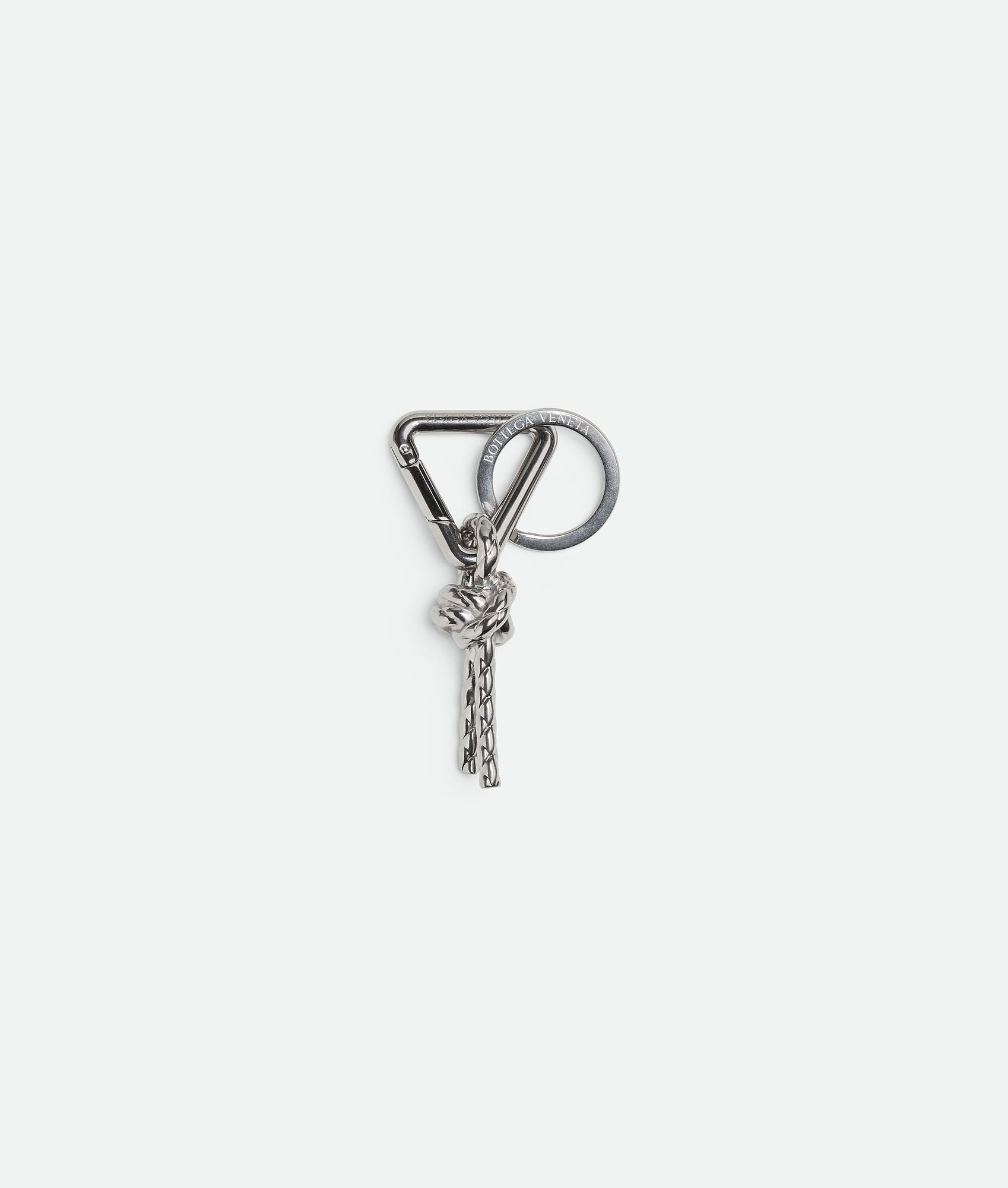 Metal key ring with signature knot detail, coaxial pattern, and triangle hook. Product Details - Metallic knot key ring with a coaxial pattern and triangle hook. - Hardware: Silver finish - Height: 10 cm | 3.9" - Width: 3 cm | 1.2" - Depth: 3 cm | 1.2" - Made in: Italy - Product code: 842767VCQP08101 Material - Material: Metal