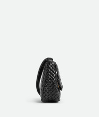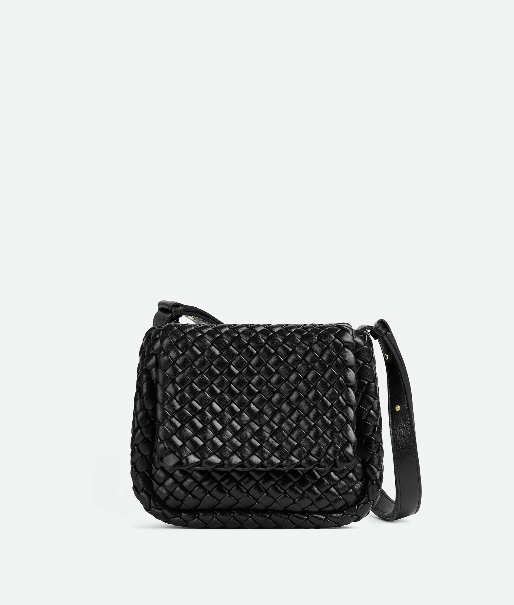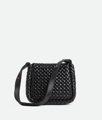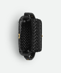 Shoulder bag crafted in soft padded Intreccio leather with adjustable strap. This Product Details - Mini padded Intreccio leather shoulder bag - One interior zippered pocket, one open pocket - Metal closure - Material: Lambskin - Unlined - Color: Black - Hardware: Gold finish - Height: 17 cm | 6.7" - Width: 19 cm | 7.5" - Depth: 6 cm | 2.4" - Handle drop: 21 cm | 8.3" - Made in: Italy - Product code: 762711V01D18425 Size & Fit - Fits iPhone 15 Pro Max, a credit card case, airpods and keys.