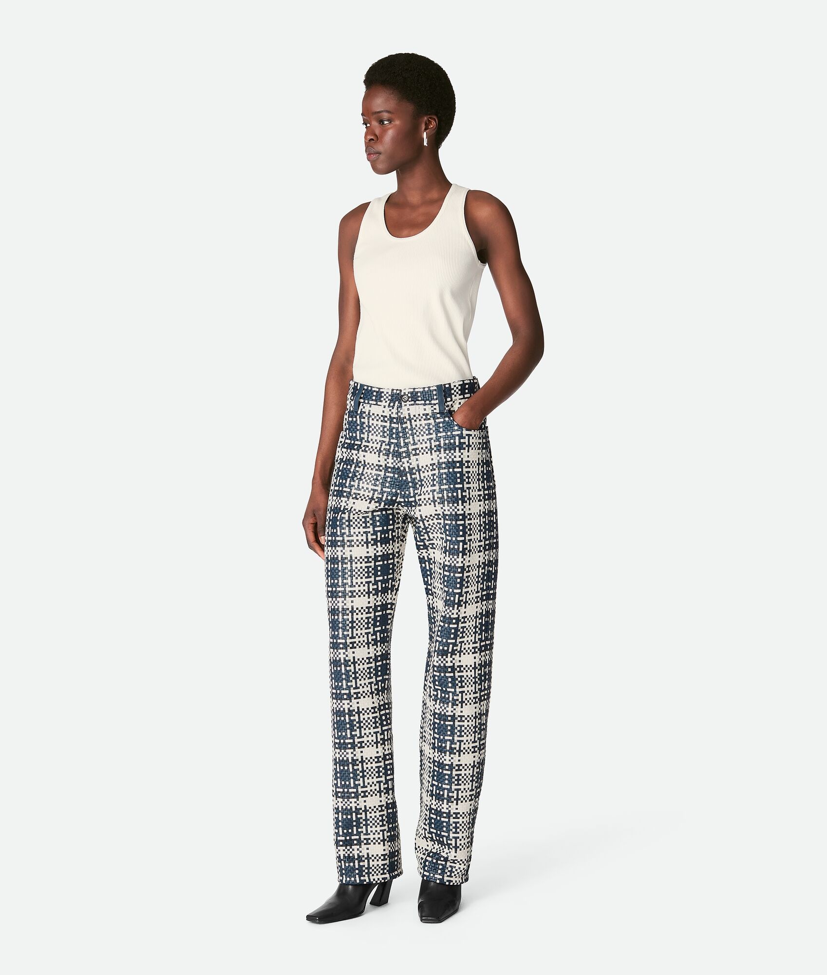 Product Details - Multicolor check mini Intreccio leather pants - Straight leg - Unlined - Button closure - Color: Deep Blue/White/Black/Gray - Made in: Italy - Product code: 841463V5NS03181 Size & Fit - Model is 179 cm | 5'10" and is wearing a Bottega Veneta size 38