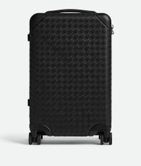 Product Details - Cabin trolley with durable, custom-molded ABS shell wrapped in supple Intrecciato calfskin leather - Cabin size - Volume: 38L - Calfskin leather handles and trims - Detachable Intrecciato leather tag holder - Organized canvas interior composed of one zipped compartment and one strapped compartment featuring a detachable divider with a flat zipped pocket - Zip closure with TSA lock system - Four 360° wheels and telescopic handle - Lining: Canvas - Color: Black - Hardware: Silver finish - Made in: Italy - Product code: 851376V56Y18803 Material - Material: Calfskin Size & Fit - Height: 55 cm | 21.7" - Width: 35 cm | 13.8" - Depth: 21 cm | 8.3" - Weight: 4.5 kg