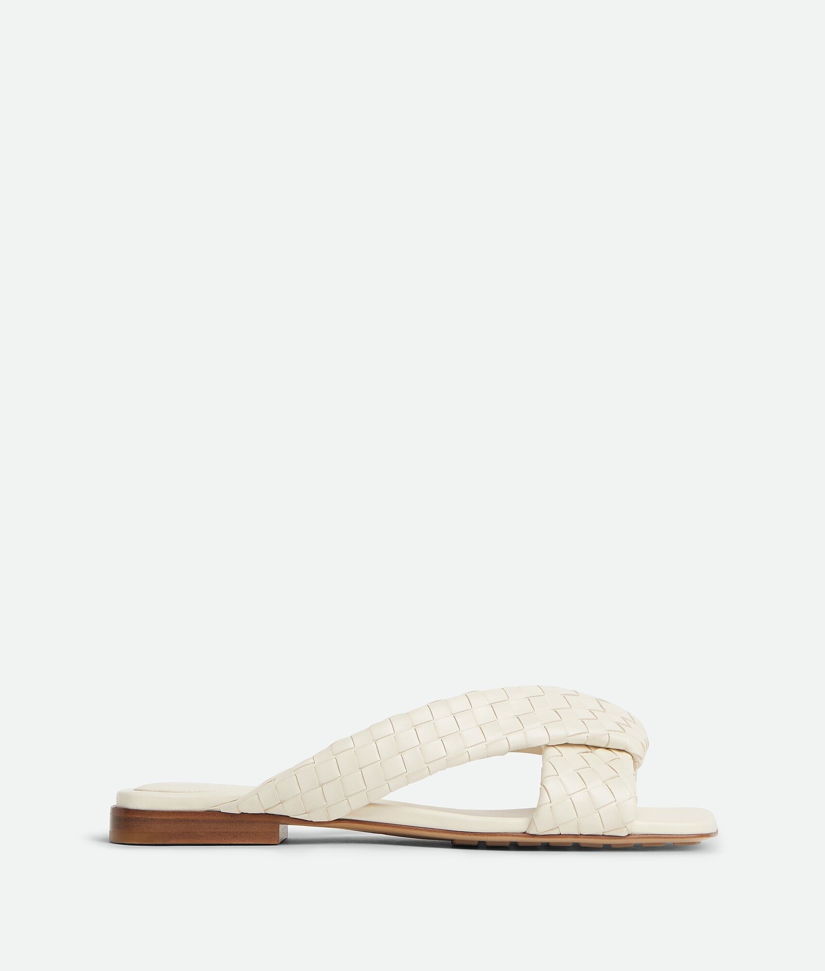Flat mule sandal in woven lambskin with padded tubular straps and twisted design. Product Details - Woven leather flat mule sandal - Lining: Lambskin - Color: Sea Salt - Rubber-injected leather outsole - Made in: Italy - Product code: 837897V2ED09031