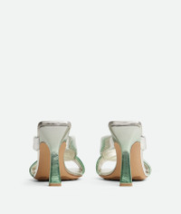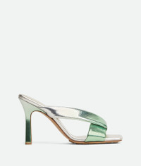 Mule sandal in laminated degrade leather with padded tubular straps and twisted design. Product Details - Reflective degrade leather mule sandal - Material: Goatskin - Lining: Laminated lambskin - Colour: Silver/Fresh Mint - Rubber injected leather outsole - Heel: 9 cm | 3.5” - Made in: Italy - Product code: 827612V5FN08131