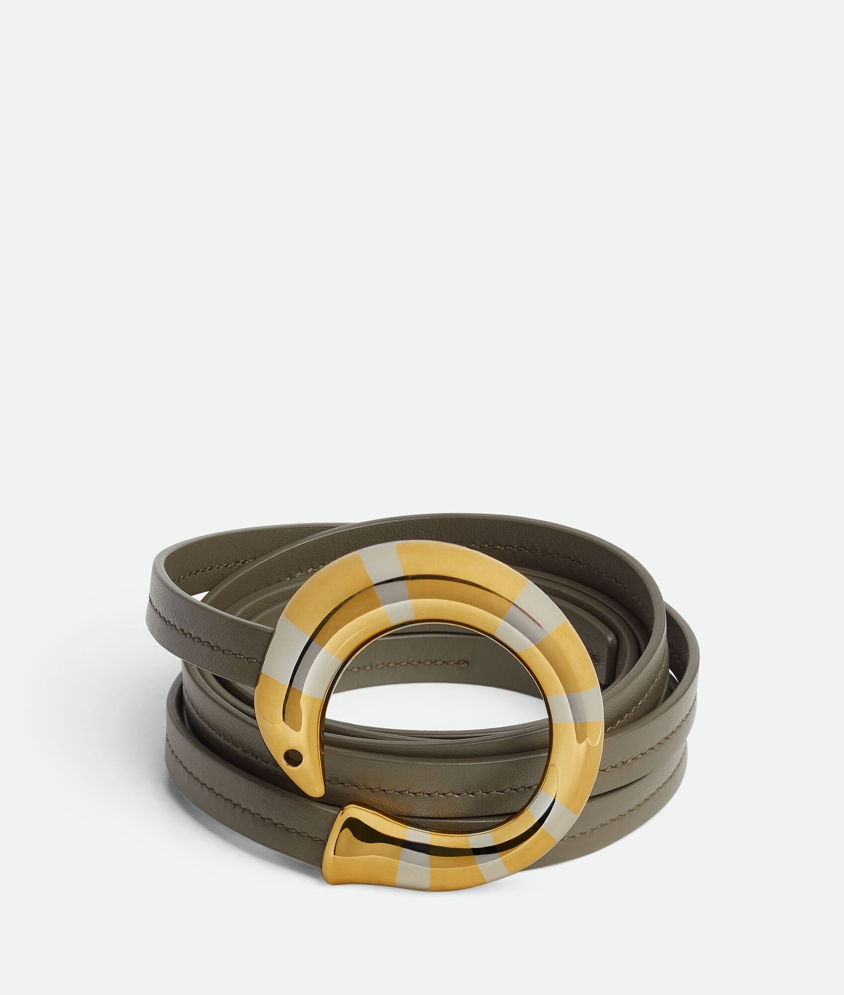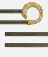 Belt in smooth calf leather with sculptural striped buckle in sardine-inspired form. Product Details - Smooth calf leather belt - Metal striped sardine buckle - Knot fastening closure - Material: Calfskin - Lining: Calf leather - Color: String - Hardware: Muse Brass & Silver finish - Height: 2 cm | 0.8" - Depth: 0.5 cm | 0.2" - Made in: Italy - Product code: 794486V2BE73236