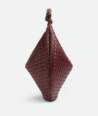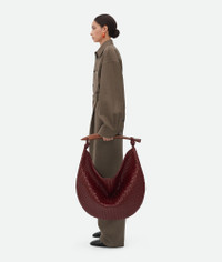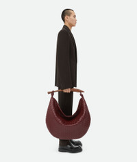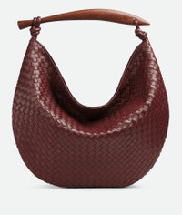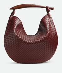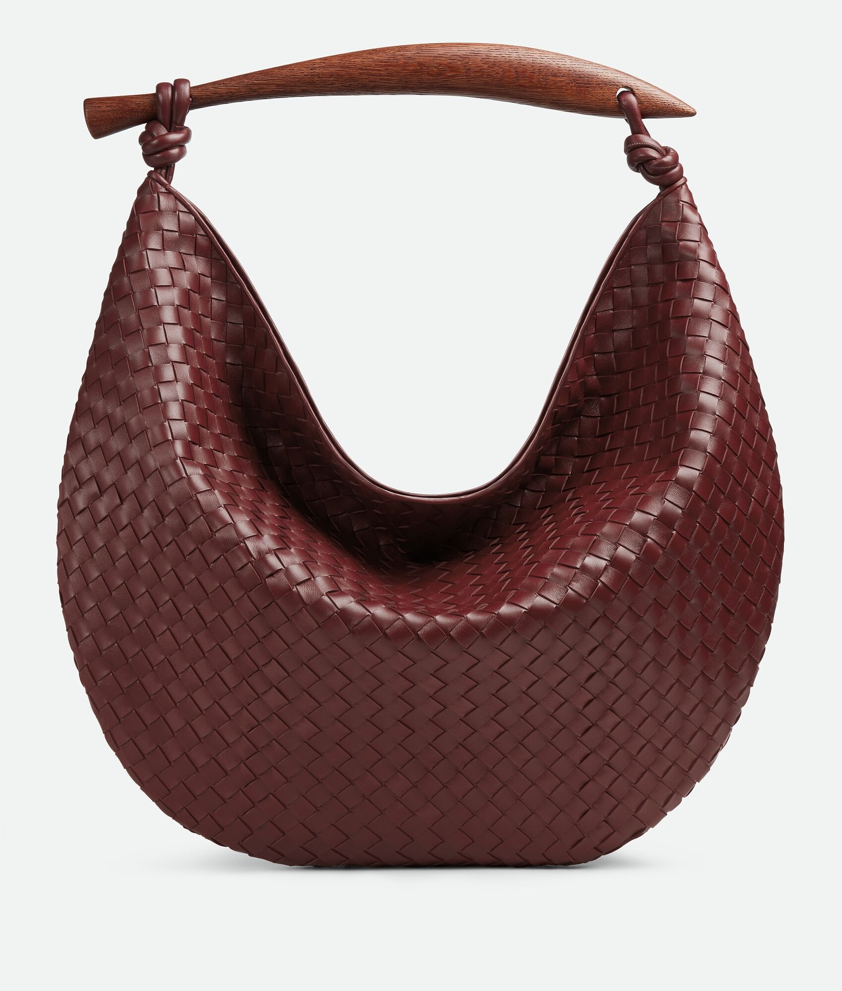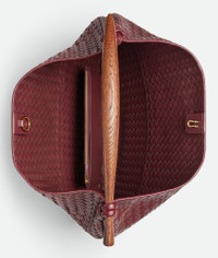 Maxi bag in supple Intrecciato leather with a sculptural rovere oak top handle. Product Details - Maxi Intrecciato leather bag with rovere oak top handle - Metallic hook closure - Single detachable interior zipped pocket - The rovere oak handle is crafted by artisans and showcases natural nuances making each piece unique - Material: Lambskin - Lining: Calfskin bonded Intrecciato - Color: Cherry/Rhum - Hardware: Brass finish - Height: 52 cm | 20.5" - Width: 65 cm | 25.6" - Depth: 13 cm | 5.1" - Handle drop: 25 cm | 9.8" - Made in: Italy - Product code: 786167V3IV86446