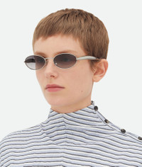 Oval sunglasses in metal with sculptural sardine shape temples. Product Details - Temples with sculptural sardine shape - Lenses made from polyamide with 39% bio-based content - BV1386S 003 - Color: Silver/Grey - Made in: Japan - Product code: 821495V44508107 Material - Material: Metal