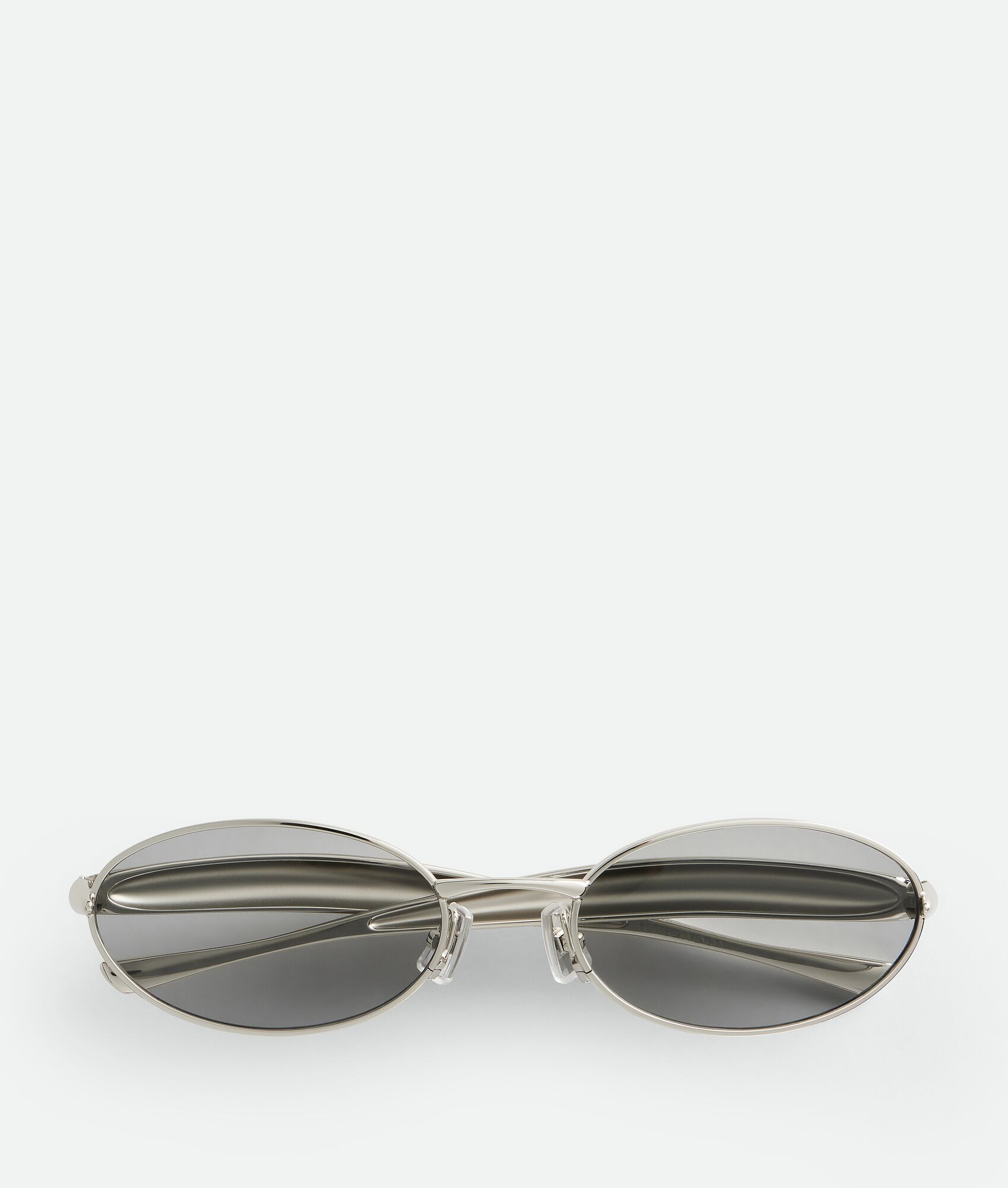 Oval sunglasses in metal with sculptural sardine shape temples. Product Details - Oval sunglasses made with metal - Temples with sculptural sardine shape - Lenses made from polyamide with 39% bio-based content - BV1386S 007 - Color: Silver/Gray - Made in: Japan - Product code: 821495V44508118 Material - Material: Metal Size & Fit - Lens width: 57 mm | 2.2" - Bridge length: 21 mm | 0.8" - Temple length: 135 mm | 5.3"