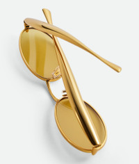 Oval sunglasses in gold-finished metal with sculptural sardine shape temples. Product Details - Oval sunglasses made with metal - Temples with sculptural sardine shape - Lenses made from polyamide with 39% bio-based content - BV1386S 005 - Color: Gold/Yellow - Made in: Japan - Product code: 821495V44508224 Material - Material: Metal Size & Fit - Lens width: 57 mm | 2.2" - Bridge length: 21 mm | 0.8" - Temple length: 135 mm | 5.3"