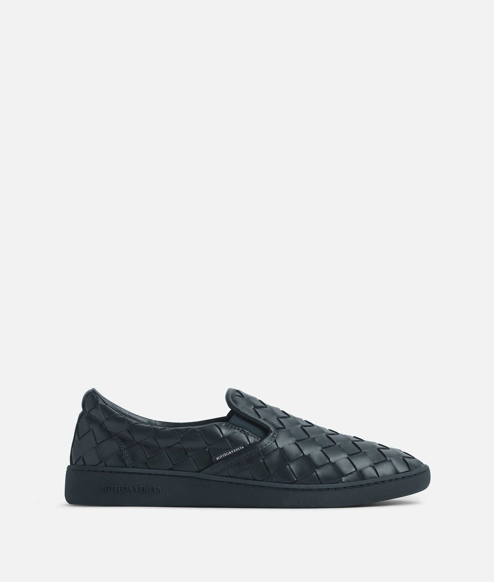 Slip-on sneaker realised with all-over Intrecciato craftsmanship in soft calfskin. Product Details - Intrecciato leather slip-on sneaker - Material: calfskin - Lining: Calfskin - Color: Shadow - Rubber outsole - Made in: Italy - Product code: 775320V3HB04207