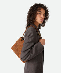 Product Details - Small Intrecciato suede top-handle bag with sliding cross-body strap - Compartmented interior with one zipped pocket, one open pocket - Magnetic closure - Lining: Suede bonded Intrecciato - Color: Amber - Hardware: Brass finish - Made in: Italy - Product code: 766014V1QE62598 Material - Material: Calfskin Size & Fit - Height: 20 cm | 7.9" - Width: 25 cm | 9.8" - Depth: 10 cm | 3.9" - Handle drop: 6 cm | 2.4" - Strap Drop: 50 cm | 19.7"