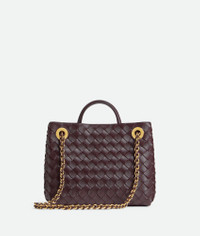 Product Details - Small Intrecciato leather top handle bag with chain strap - Compartmented interior with one zipped pocket, two open pockets - Magnetic closure - Lining: Lambskin bonded Intrecciato - Color: Dark Barolo - Hardware: Brass finish - Made in: Italy - Product code: 786008VCPP12264 Material - Material: Lambskin Size & Fit - Height: 20 cm (7.9") - Width: 25 cm (9.8") - Depth: 10 cm (3.9") - Handle drop: 6 cm (2.4") - Strap drop: 50 cm (19.7")