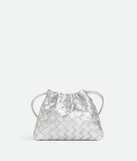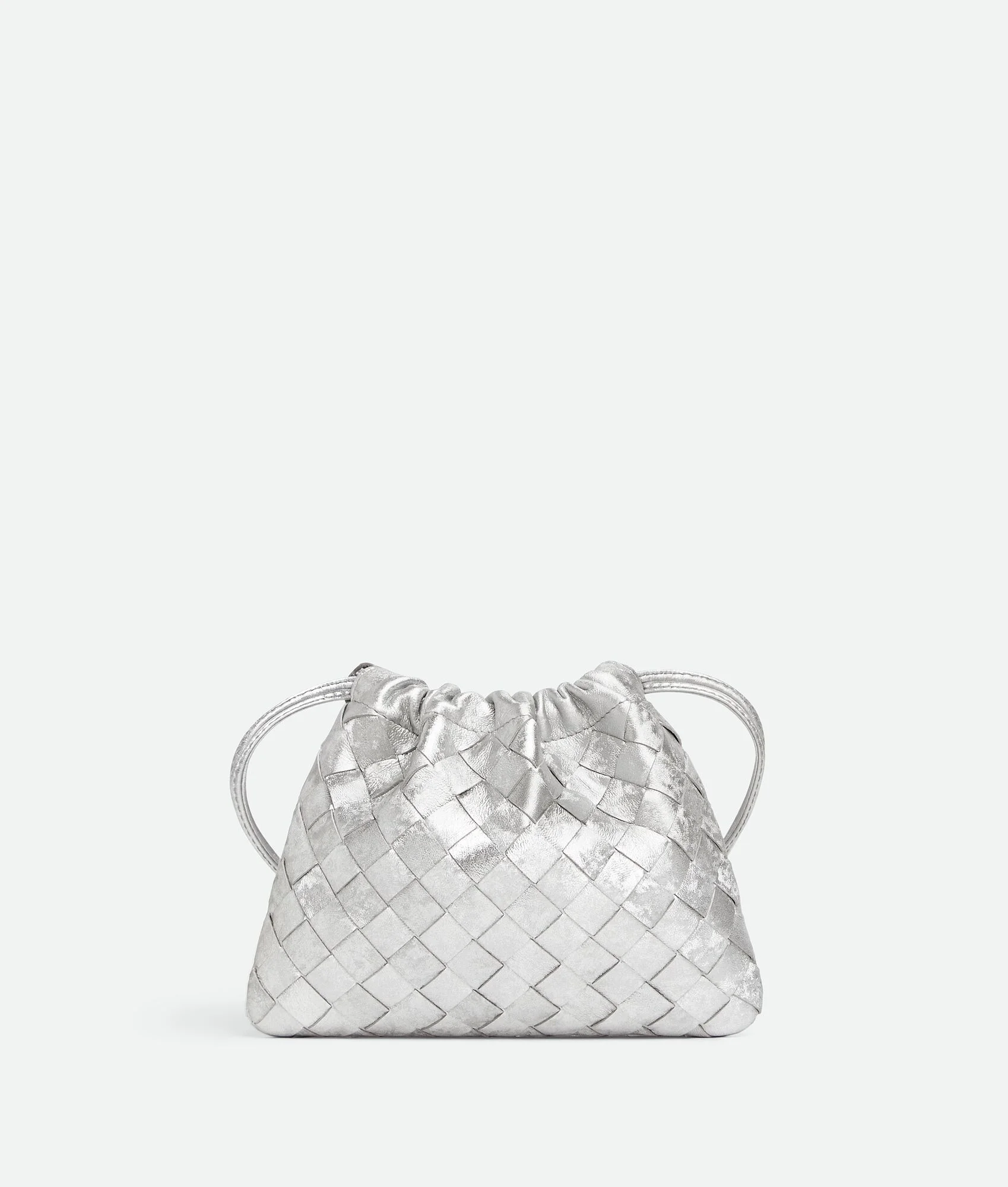 Product Details - Intrecciato lamina satin leather pouch - One main compartment - Drawstring closure - Leather loop attachment with snap button for cross-body carry - Lining: Nylon - Color: Silver - Hardware: Silver finish - Made in: Italy - Product code: 816987V5XF08101 Material - Material: Lambskin Size & Fit - Height: 16.6 cm | 6.5" - Width: 21 cm | 8.3" - Depth: 1 cm | 0.4" - Strap drop: 55 cm | 21.7"