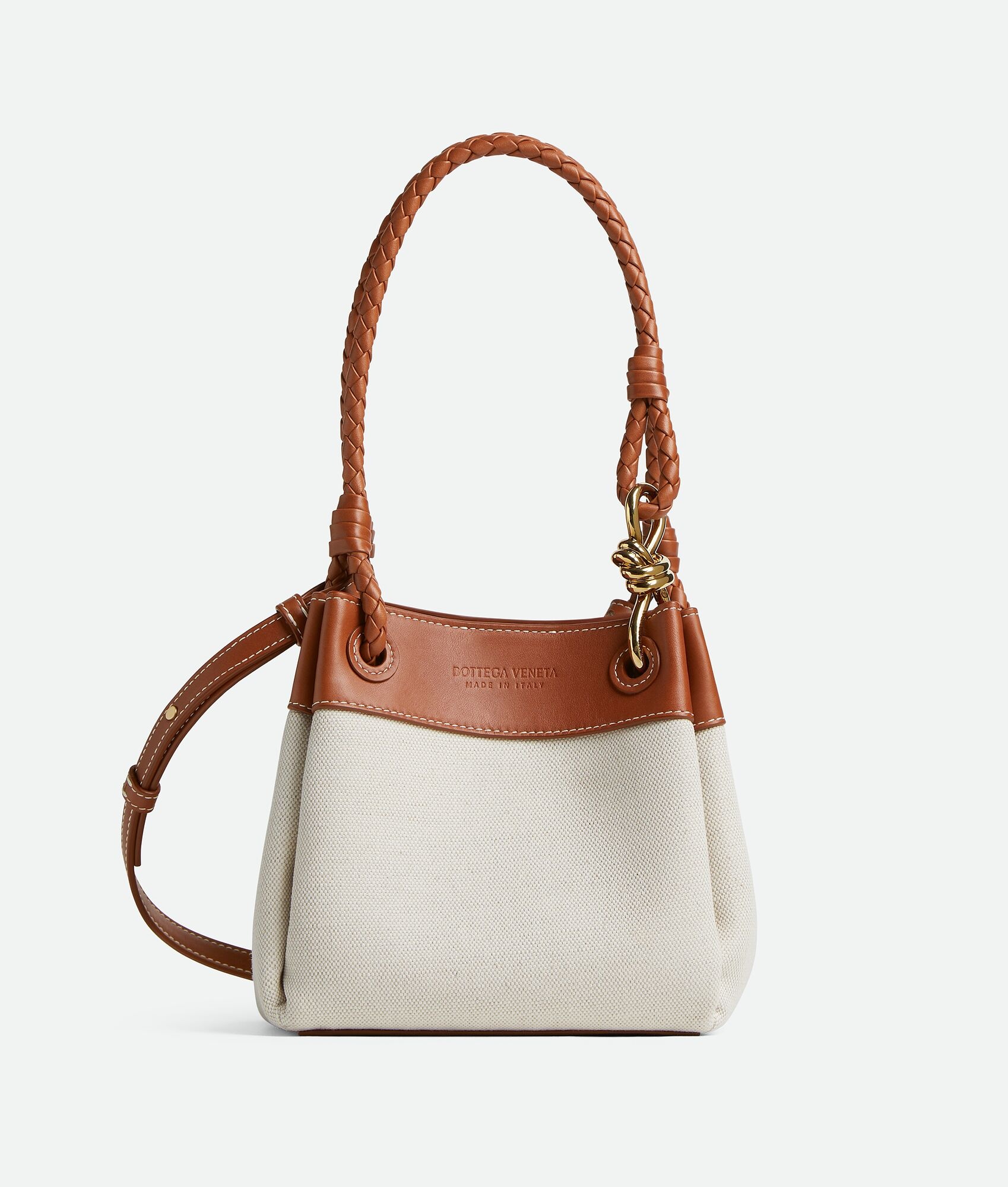 Shoulder bag in canvas and leather with signature knot detail and detachable cross-body Product Details - Small canvas and leather shoulder bag with detachable cross-body strap - One main compartment - Magnetic tab closure - Material: Cotton, linen, polyurethane, calfskin - Lining: Canvas - Color: Natural/Lightwood - Hardware: Brass finish - Height: 16.5 cm | 6.5" - Width: 20cm - Depth: 17 cm | 6.7" - Handle drop: 20cm - Strap drop: 55cm - Made in: Italy - Product code: 826220VMAXN9837