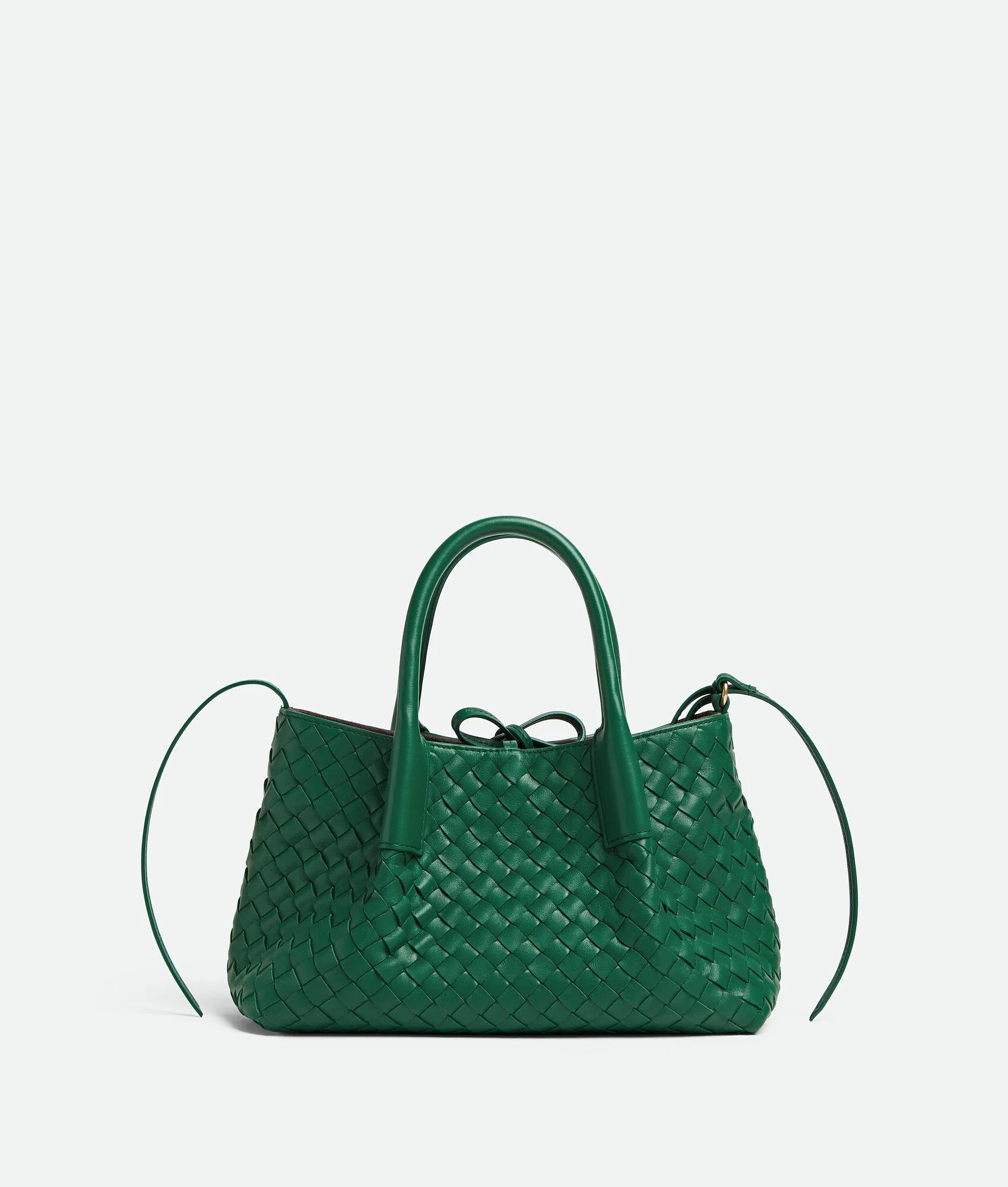 Tote bag in Intrecciato silky calf leather with adjustable and detachable strap. Product Details - Small Intrecciato silky calfskin tote bag with adjustable and detachable strap - Single detachable interior zipped pocket - Double leather tie closure - Lining: Suede - Color: Jungle/Fondant - Hardware: Brass finish - Made in: Italy - Product code: 819004V5AG13120 Material - Material: Calfskin Size & Fit - Height: 15 cm (5.9") - Width: 24 cm (9.4") - Depth: 12 cm (4.7") - Handle drop: 11 cm (4.3") - Strap drop: 47 cm (18.5")