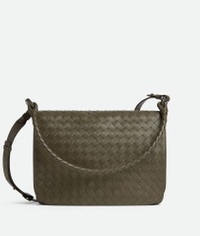 Messenger bag in Intrecciato leather with double strap. Product Details - Intrecciato leather messenger with one adjustable and detachable cross-body strap and one coaxial shoulder strap - Single interior zipped pocket, double flat phone pocket and key hook on a strap - Flap closure secured by magnets - Lining: Canvas - Color: Cypress - Hardware: Silver finish - Height: 26 cm | 10.2" - Width: 35 cm | 13.8" - Depth: 7.5 cm | 3" - Handle drop: 25 cm | 9.8" - Strap drop: 50 cm | 19.7" - Made in: Italy - Product code: 795074V2HL13238