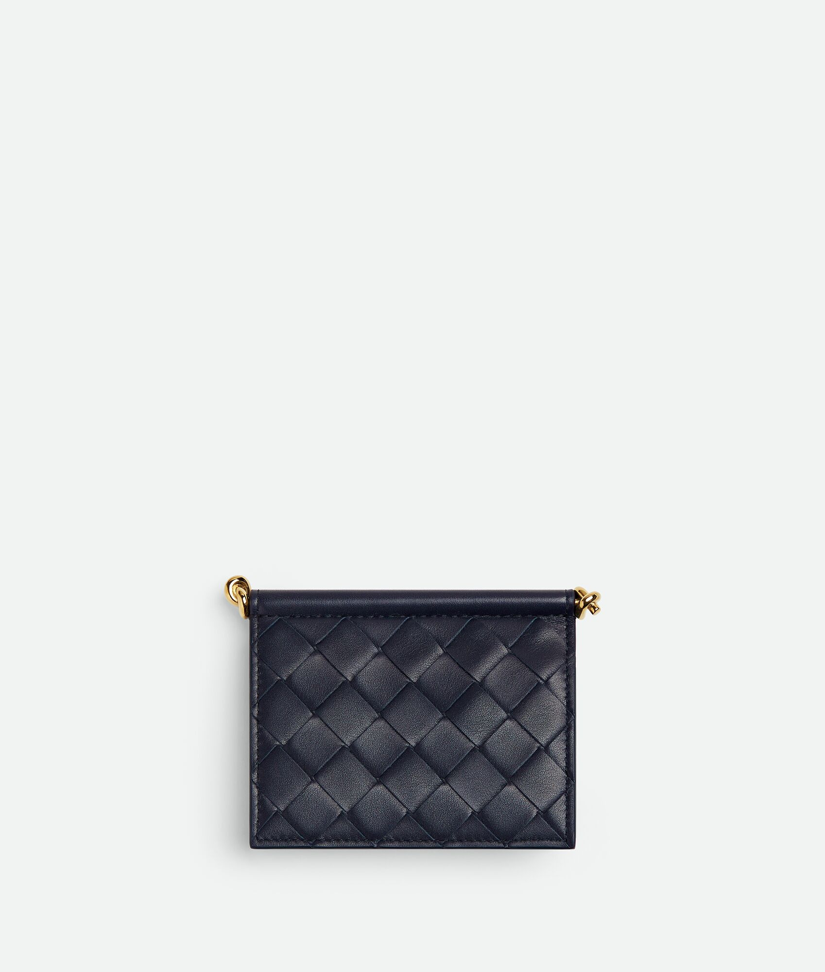 Business card case in Intrecciato calf leather with signature knot details. Product Details - Intrecciato calfskin leather card case with metal knot details - One compartment - Press-stud closure - Lining: Calf leather - Color: Nocturnal - Hardware: Muse Brass finish - Made in: Italy - Product code: 810596V4R414184 Material - Material: Calfskin Size & Fit - Height: 7.8 cm | 3.1" - Width: 11 cm | 4.3" - Depth: 2.5 cm | 1"