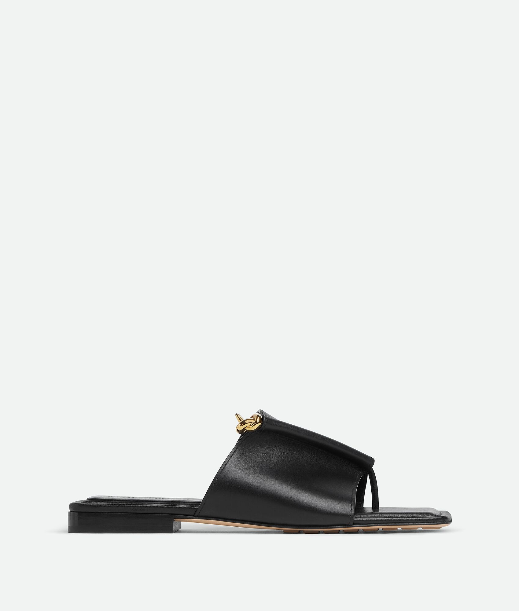 Flat thong sandal in calfskin leather with signature metallic knot detail. Product Details - Flat thong sandal in calf leather with signature metallic knot detail. - Lining: Lambskin - Color: Black - Rubber-injected leather outsole - Made in: Italy - Product code: 837829V5SV01000