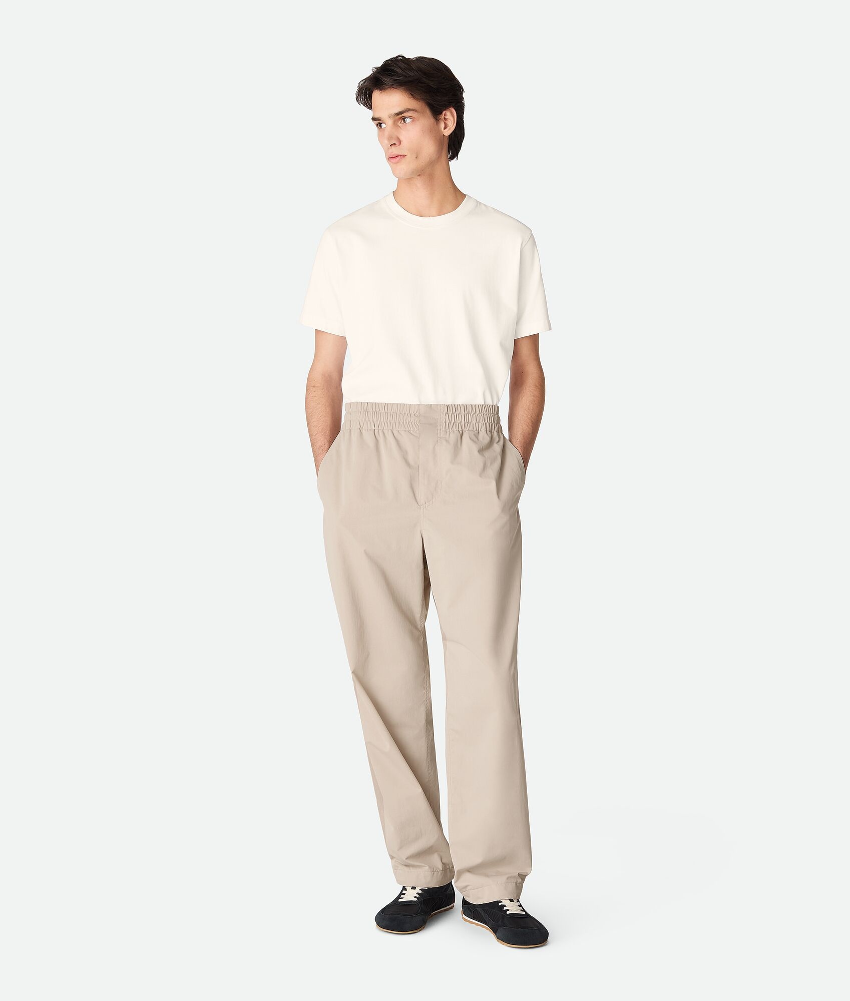 Trousers with straight leg in washed matte technical nylon. Product Details - Washed matte tech nylon pants - Straight leg - Elasticated waistband - Lined - Color: Gray Putty - Made in: Italy - Product code: 836964V5O302674 Size & Fit - Model is 189 cm|6'2" and is wearing a Bottega Veneta size 46